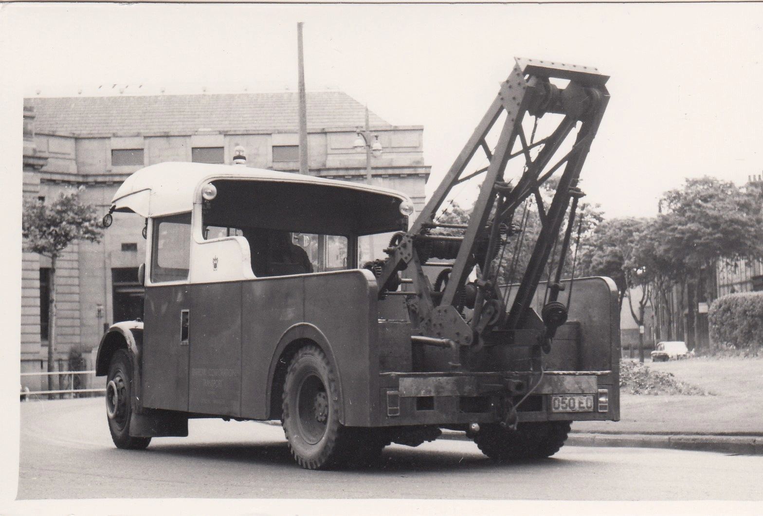 In 1963 Bus No 124 EO 9051 was selected from a batch of 1949 Leyland PD2/3 double deck buses that had recently been withdrawn. The body was removed and the chassis shortened. The job of constructing a new tow wagon body was given to the depot apprentices. The cab, a couple of window pans and the rear dome were re-cycled from the scrap bus body, the rear dome being turned around and used above the cab. The Harvey Frost crane was removed from the old tow wagon and was welded onto the chassis of the 'new' vehicle which only ever ran with trade plates, it never carried a registration plate.